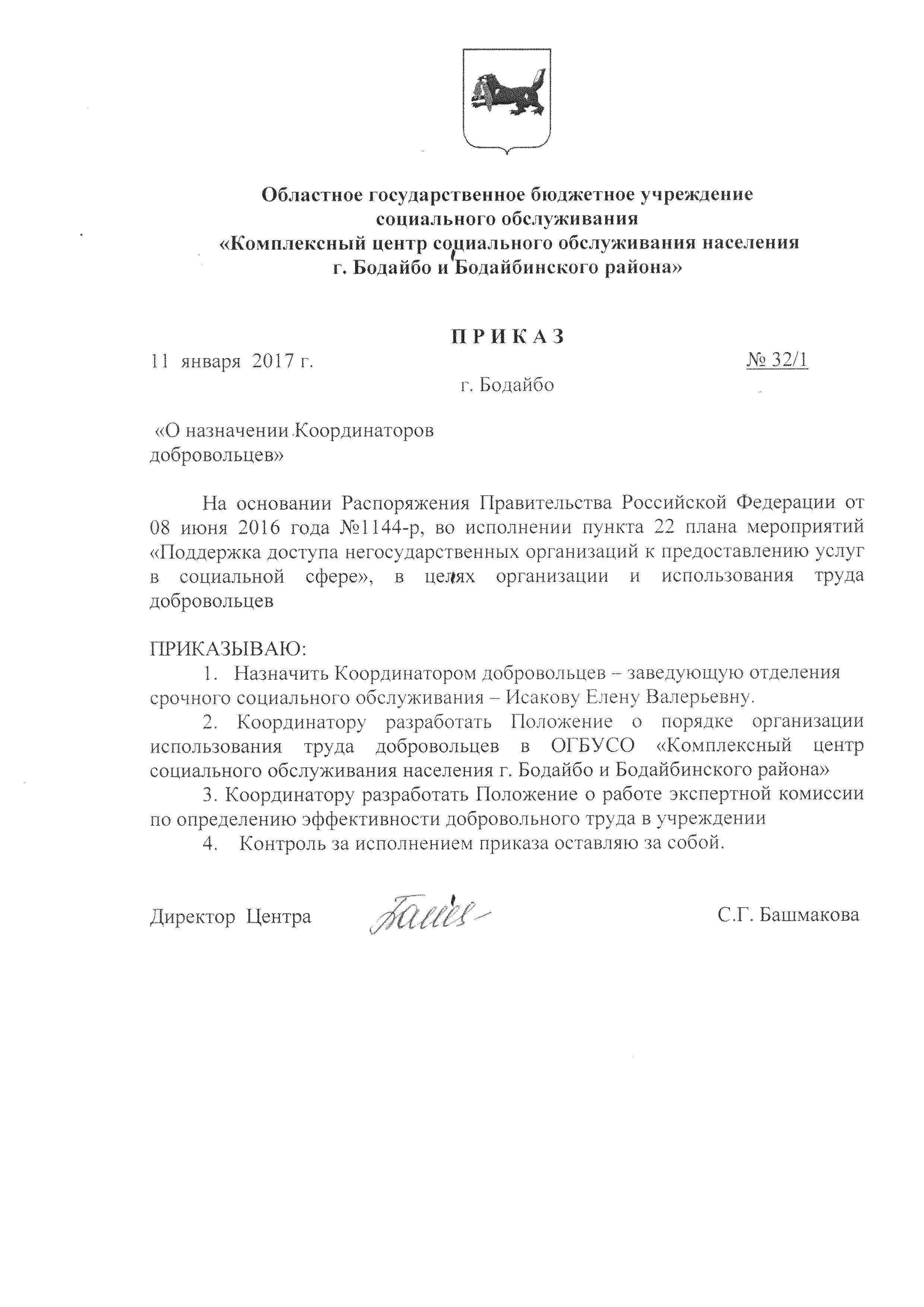 Приказ о назначении координаторов добровольцев